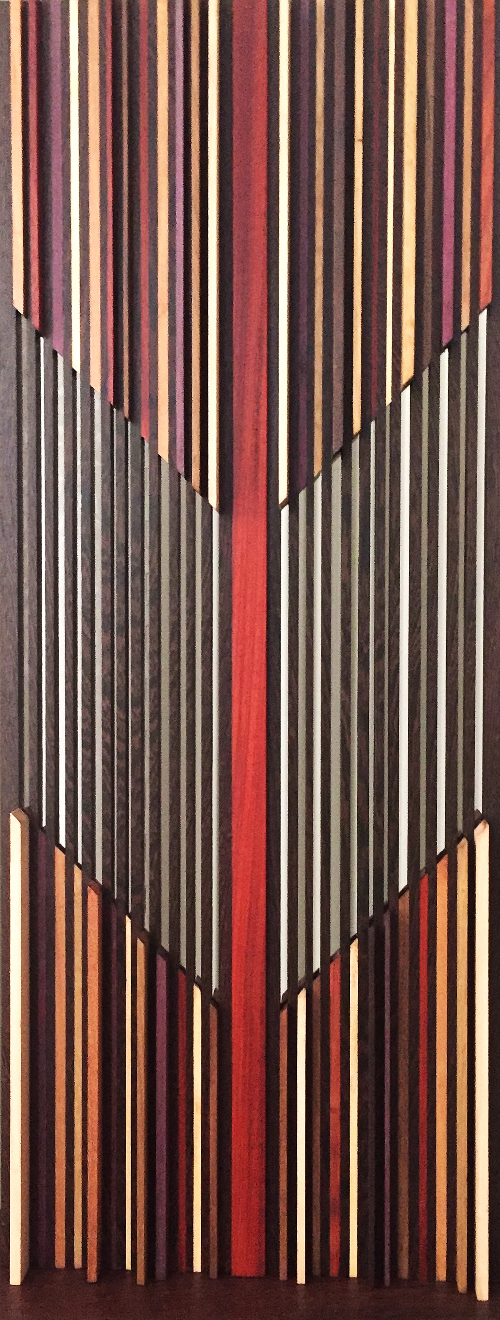 À gauche : Le violon de Clara (2023, relief en bois – avec comme essences le sipo, le wengé, le frêne, et le hêtre – et cuivre, 109 cm x 13,2 cm x 3 cm, collection de l’artiste). Photo : Martin Baeten À droite : Paix 2 (2024, relief en bois – avec comme essences le padouk, le wengé, l’azobé, le massaranduba, le frêne, le hêtre, le chêne, le chêne français, le poirier, le sipo, le noyer, l’amarante, le noyer de Patagonie et l’afzelia, 100 x 40 x 8 cm / socle : 48 x 20 x 2 cm, collection de l’artiste). Photo : Martin Baeten |