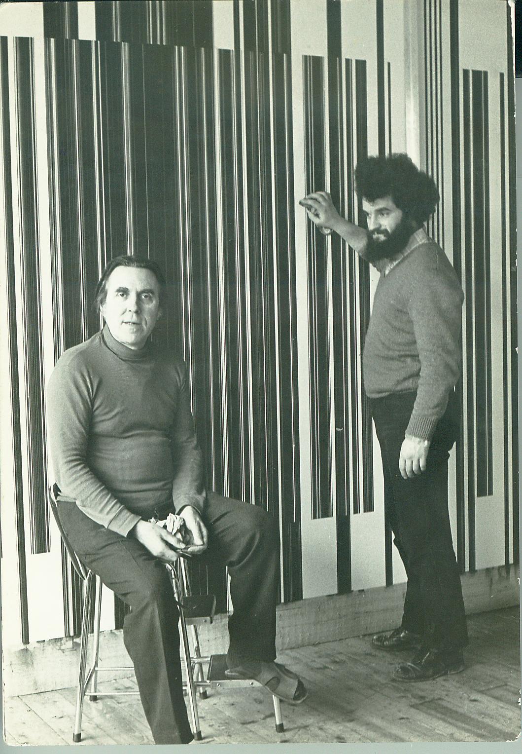 Martin Baeten (à droite) en 1973 dans l'atelier de Luc Peire à Knokke, travaillant sur les parois-graphies