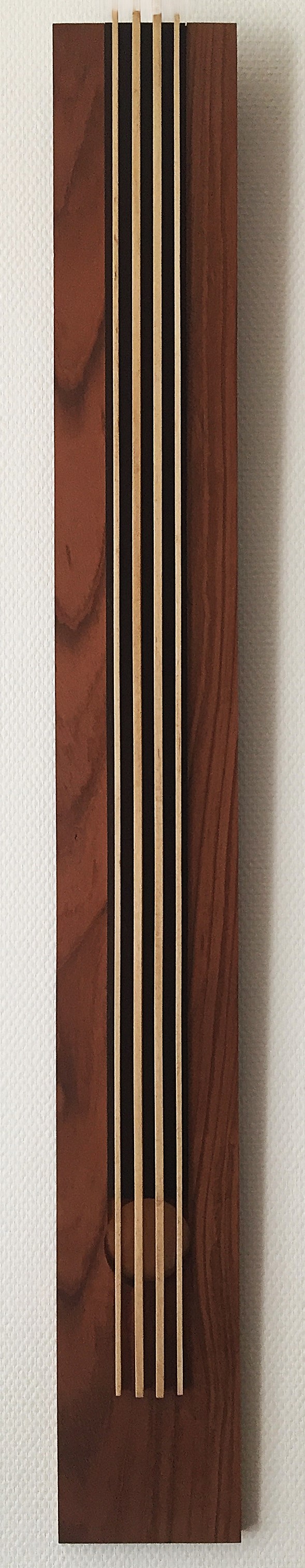 À gauche : Le violon de Clara (2023, relief en bois – avec comme essences le sipo, le wengé, le frêne, et le hêtre – et cuivre, 109 cm x 13,2 cm x 3 cm, collection de l’artiste). Photo : Martin Baeten À droite : Paix 2 (2024, relief en bois – avec comme essences le padouk, le wengé, l’azobé, le massaranduba, le frêne, le hêtre, le chêne, le chêne français, le poirier, le sipo, le noyer, l’amarante, le noyer de Patagonie et l’afzelia, 100 x 40 x 8 cm / socle : 48 x 20 x 2 cm, collection de l’artiste). Photo : Martin Baeten |